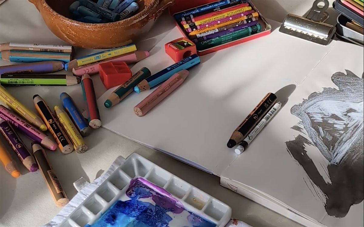 Whether you have a stack of unfinished journals or a sketchbook that's been gathering dust, this is your dedicated time to dive in and create in a supportive and relaxing atmosphere with the added bonus that a variety of artist quality materials (colored pencils, fabric scraps, gouache, etc.), a mini printer, and our collage material library are available to use.