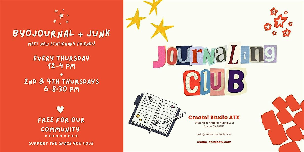 Journaling Club is open studio time for community and creativity. Bring your journal or planner, and "junk" and grab a seat, and settle in. This is unassisted studio time (no formal instruction)—beginners are welcome. Come journal, chat, and connect with friendly faces.