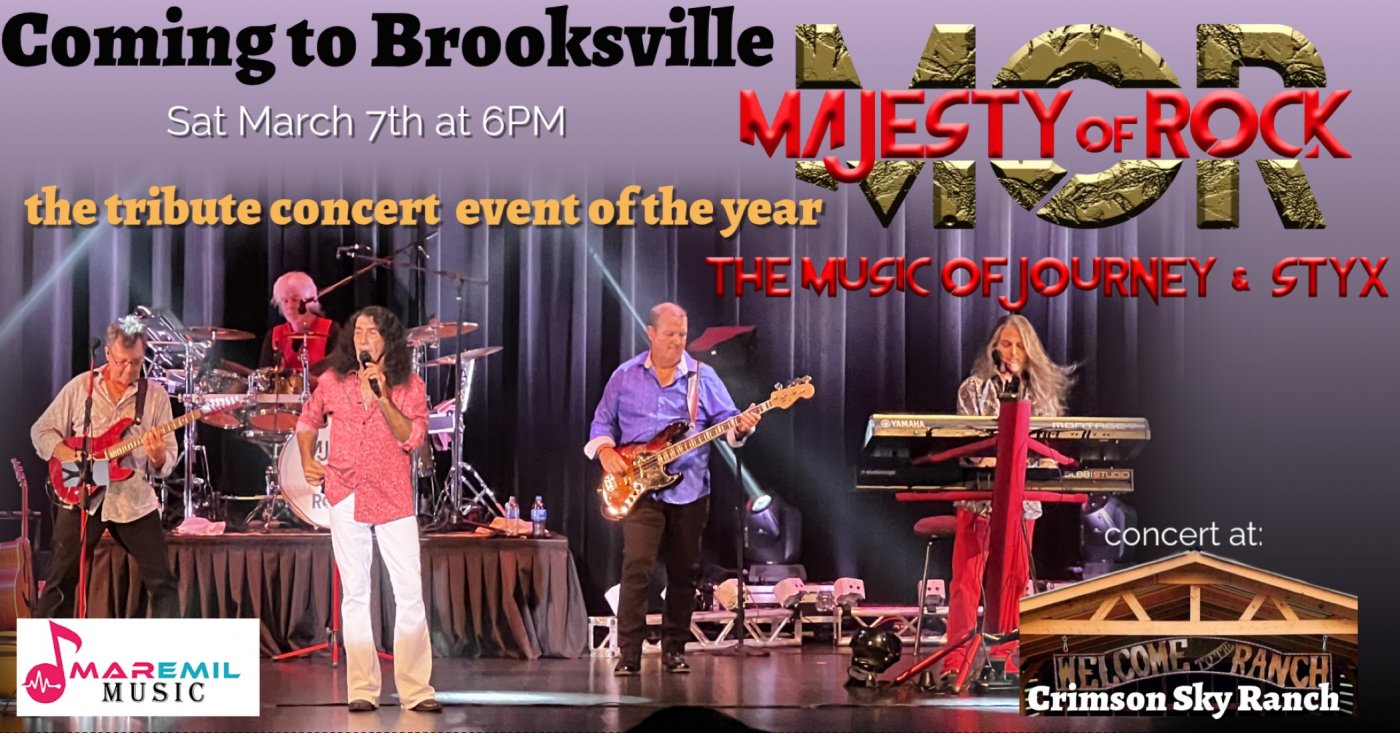 Coming to Brooksville at The Crimson Sky Ranch: Majesty of Rock - The music of Journey and Styx. This fabulous in-demand top level show will bring you the magical music of two of classic rock's most incomparable bands performed to perfection. Saturday March 7th at 6PM.