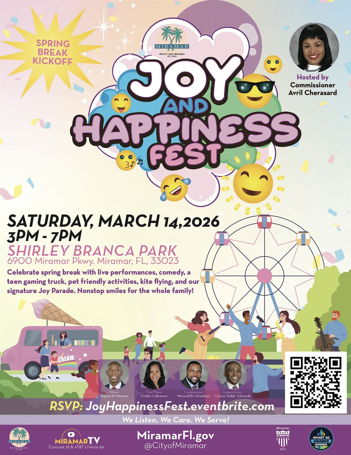 Join the City of Miramar for an afternoon of fun, laughter, and community at the Joy and Happiness Fest β a high-energy Spring Break Kickoff for the whole family.