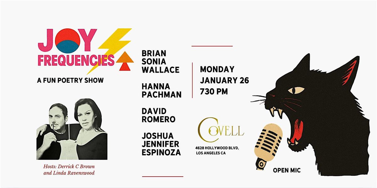 Come to Los Feliz and walk through the secret bookshelf at Covell (back by bathrooms) and enter Joy Frequencies, a hidden holiday oasis of poetry, music and comfort. Sip remarkable wine, enjoy the finest snacks and let ANTEDATE RECORDS carry the room as our live house band. Hosts Derrick C Brown and Linda Ravenswood welcome poets for an evening built to slow your pulse and stir your imagination. Stay wrapped in your pajamas, stay present, stay for the open mic and leave feeling restored, or tipsy on feels!