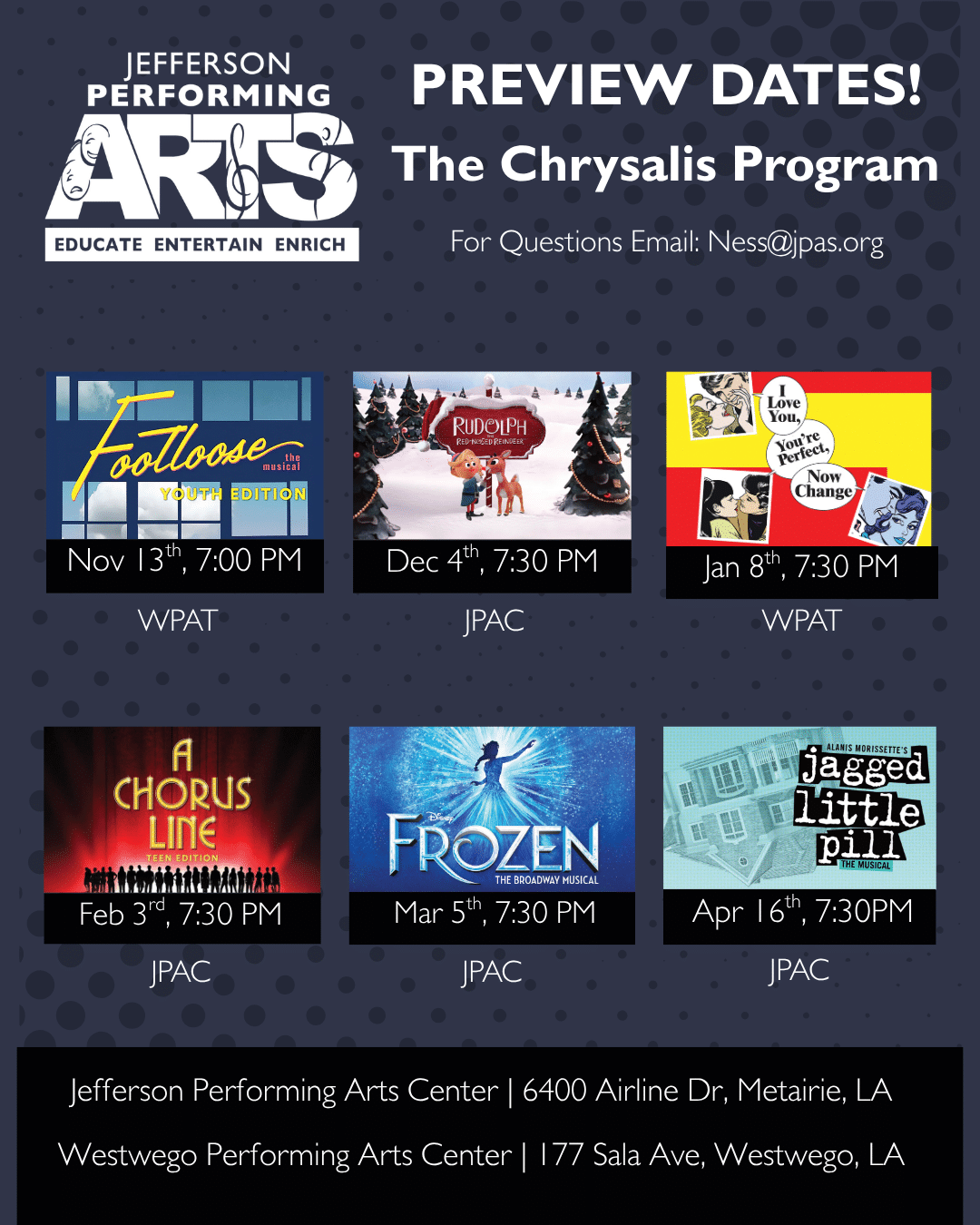 โจ Embark on an extraordinary journey at JPA Theatre Kids - A Chorus Line Teen Edition at Jefferson Performing Arts Center, where every moment promises to be unforgettable! ๐ Imagine of transforming Jefferson Performing Arts Center in the heart of Metairie, LA into a realm of endless possibilities. ๐ Join us on February 4th, 2026 at 07:30 PM for an experience that will challenge your imagination and exceed your expectations. ๐ฏ This carefully curated event combines the finest elements of entertainment, innovation, and community spirit. Whether you're an adventure seeker, culture enthusiast, or someone looking for unique experiences, this event offers something special for everyone. ๐ Don't miss this chance to be part of something extraordinary!