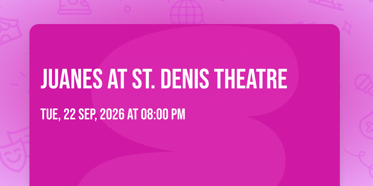 ✨ Experience the magic of Juanes at St. Denis Theatre, where moments become memories that last a lifetime! 🏛️ The iconic St. Denis Theatre in Montreal, QC sets the perfect stage for an unforgettable celebration on September 22nd, 2026 at 08:00 PM. 🌟 It's been a curated experience that brings together the best of entertainment and innovation, creating an atmosphere of wonder and excitement. From the moment you arrive, you'll be immersed in a world where the ordinary transforms into the extraordinary. 🎊 Book early to secure your place in what promises to be an event that will be talked about for years to come!