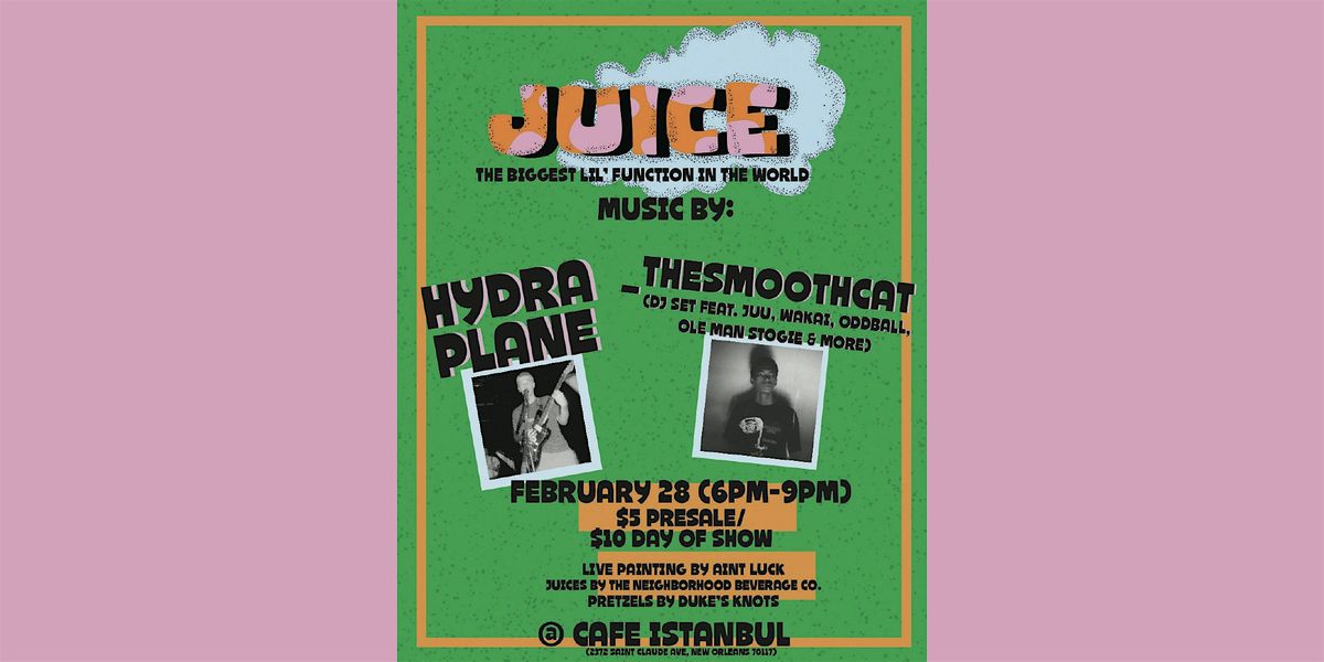 JUICE is a new live show series aimed to inspire and encourage others to continue watering their creativity. This month, we are presenting a DJ set from _THESMOOTHCAT and closing the show with an interstellar live perfermance from everyone's favorite psych rock band Hydra Plane. There will be live painting by AINT LUCK, fresh juices available from The Neighborhood Juice Co., handmade Philly- style soft pretzels from Duke's Knots, and merchandise from The Breathe Art Project.