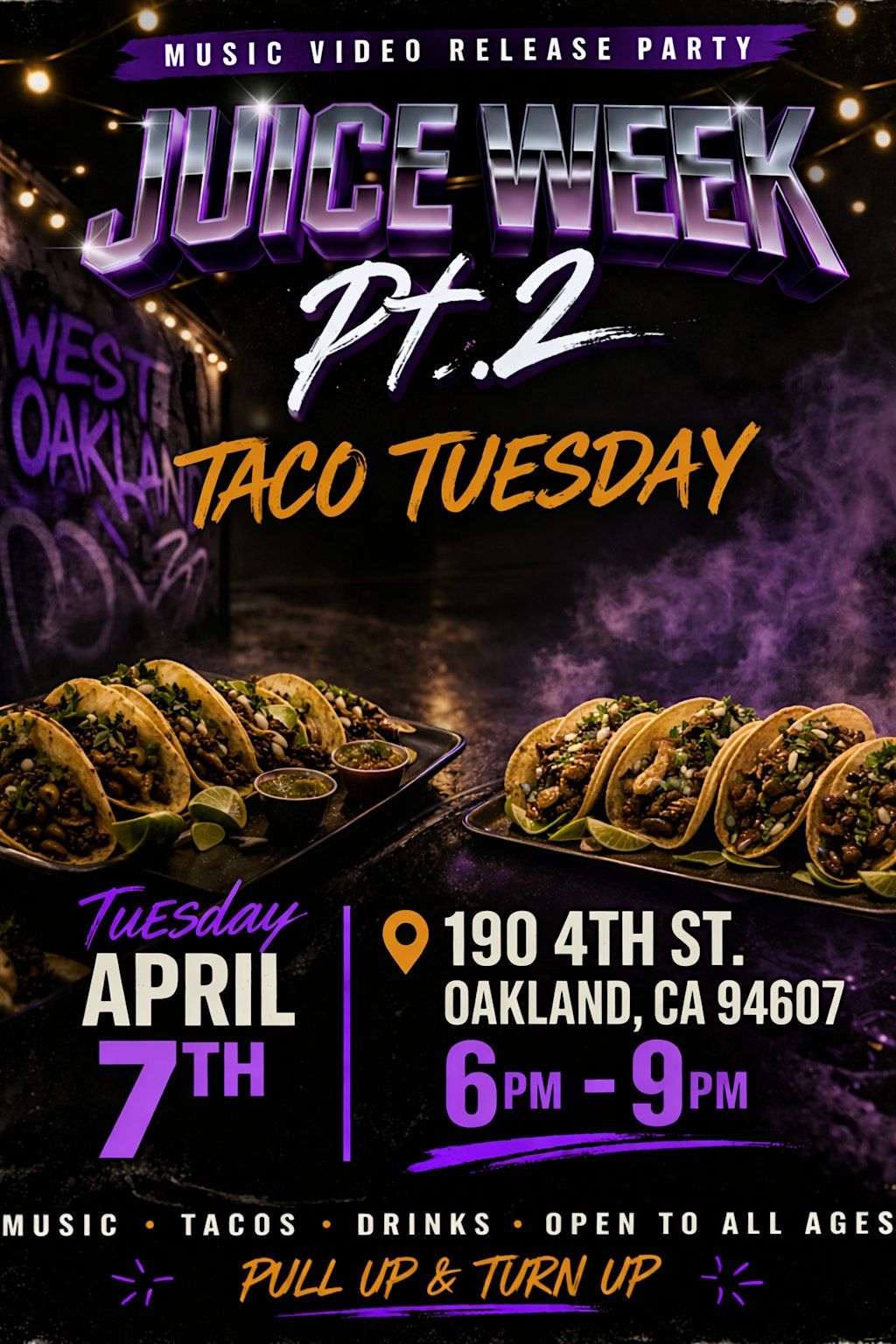 Come turn up with West Oakland Tuesday for the Juice Week Pt. 2 music video release party! It’s Taco Tuesday so you know the vibes!