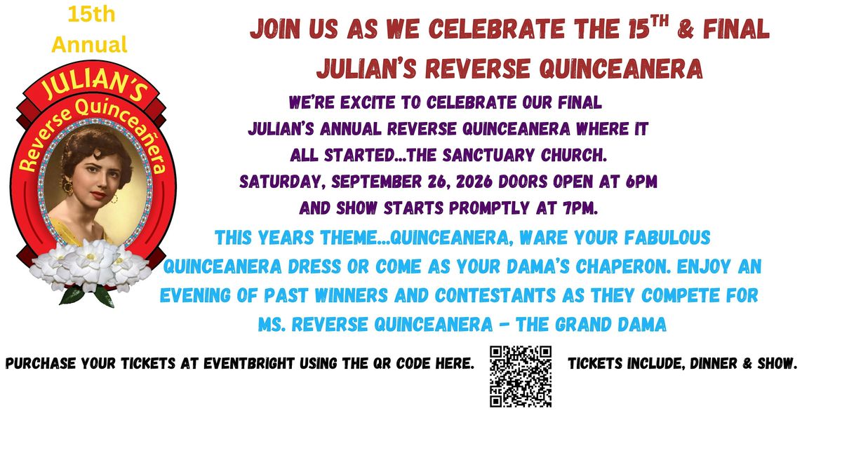 Join us as we celebrate our 15th or the Quinceanera of Julian's Annual Reverse Quinceanera. We're bringing back our past contestants and they will via for the top prize...Ms. Reverse Quinceanera - The Grand Dama. We'll be opening the show with one of Myrna's ever so tantalizing telenovelas and of course her fabuous opening number. Eat, drink and be fabulous in your Quinceanera dress or chaperon's best outfit.