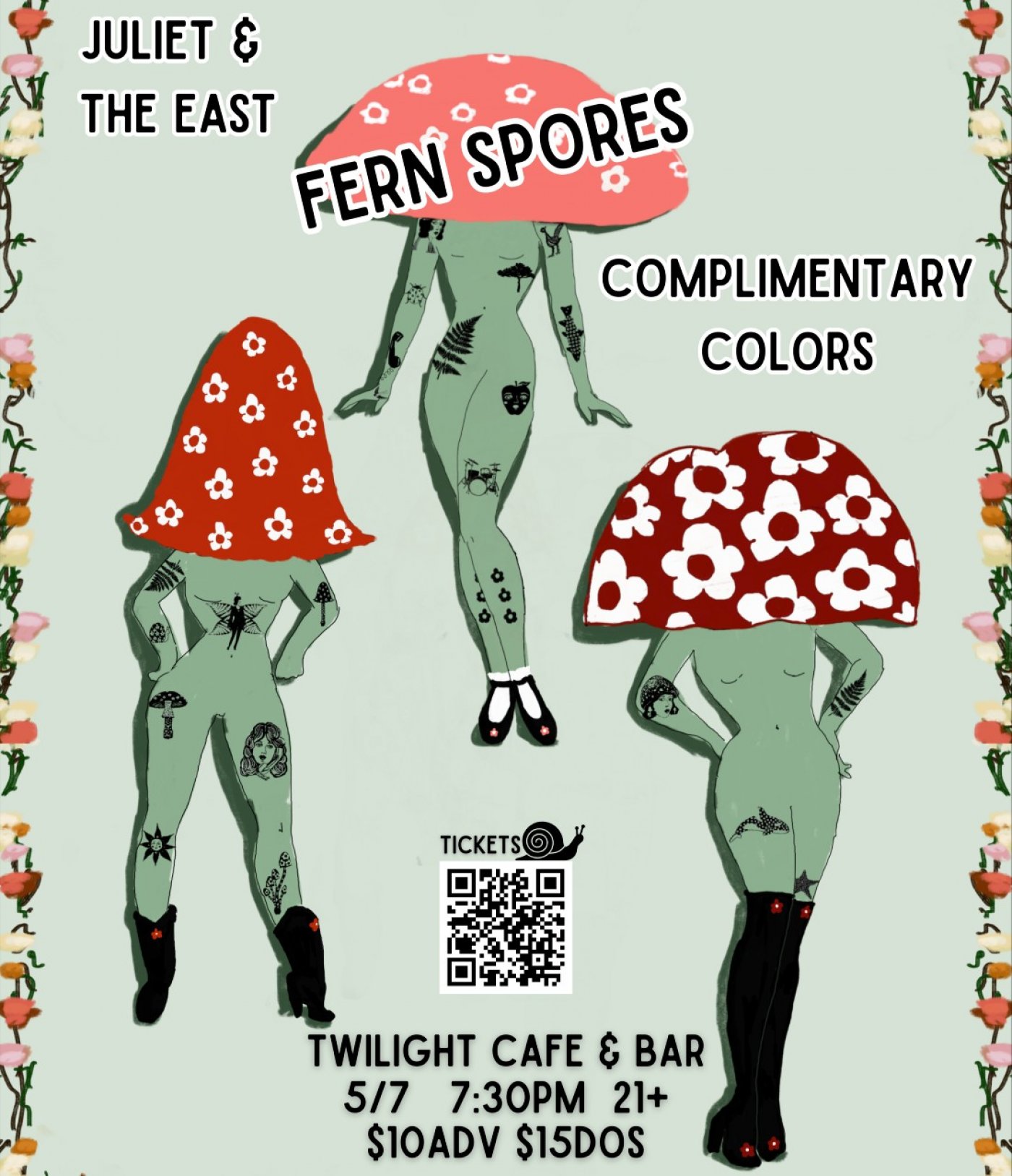 Fern Spores: Fern Spores is a femme-folk-rock band hailing from Olympia, WA. Gracefully flowing between vintage psych folk, garage rock, clever covers, and soulful Americana ballads they curate a truly original sound. Angsty but uplifting, whimsical yet fierce, and as rock as it is roll. They serve up anthems of empowerment with a sprinkle of sapphic longing and a side of revolt.