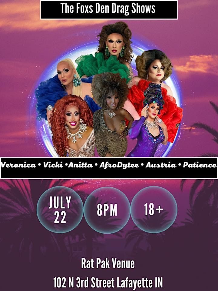 Join the Fox's Den and your host Veronica Fox for another great drag show at Rat Pak Venue, downtown Lafayette Indiana!!