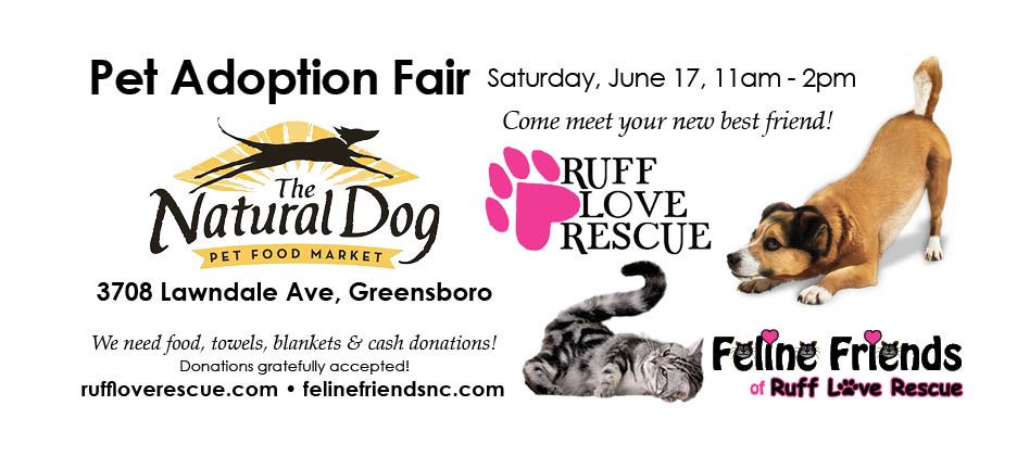 Join us June 17th for an Adoption fair at Natural Dog on Lawndale in Greensboro. Donations of towel, cleaning supplies and food always welcome.