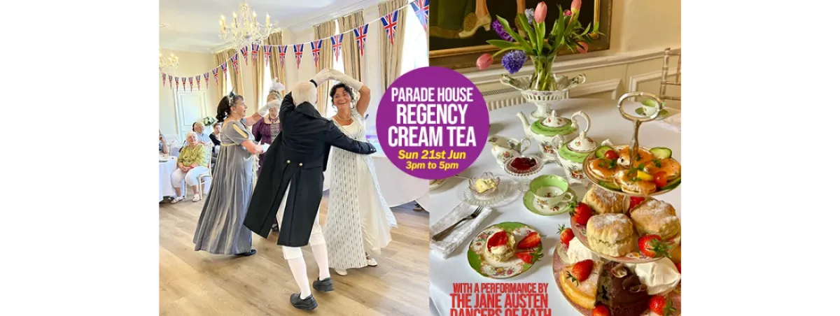 June Fathers' Day Cream Tea with the Jane Austen Dancers of Bath. Scrumptious all-butter scones with clotted cream & strawberry jam, wickedly tasty cakes, savoury sandwiches and a choice of fine tea or coffee, all served on elegant vintage china in the beautiful surroundings of Grade 1 listed Parade House. And, for an additional treat, why not start your afternoon with a delicious glass of prosecco or a gin & tonic?Feast yourself and then watch an enchanting performance of Regency dancing by the Jane Austen Dancers of Bath. Guests are invited to get up and join the fun for the final dance. WHAT A WONDERFUL WAY TO SPEND AN AFTERNOON!Please inform us if any member of your party has any dietary restrictions we need to know about. We can accommodate gluten-free provided we receive advance notice, but there is a small additional charge for a fully vegan "not-cream" tea.