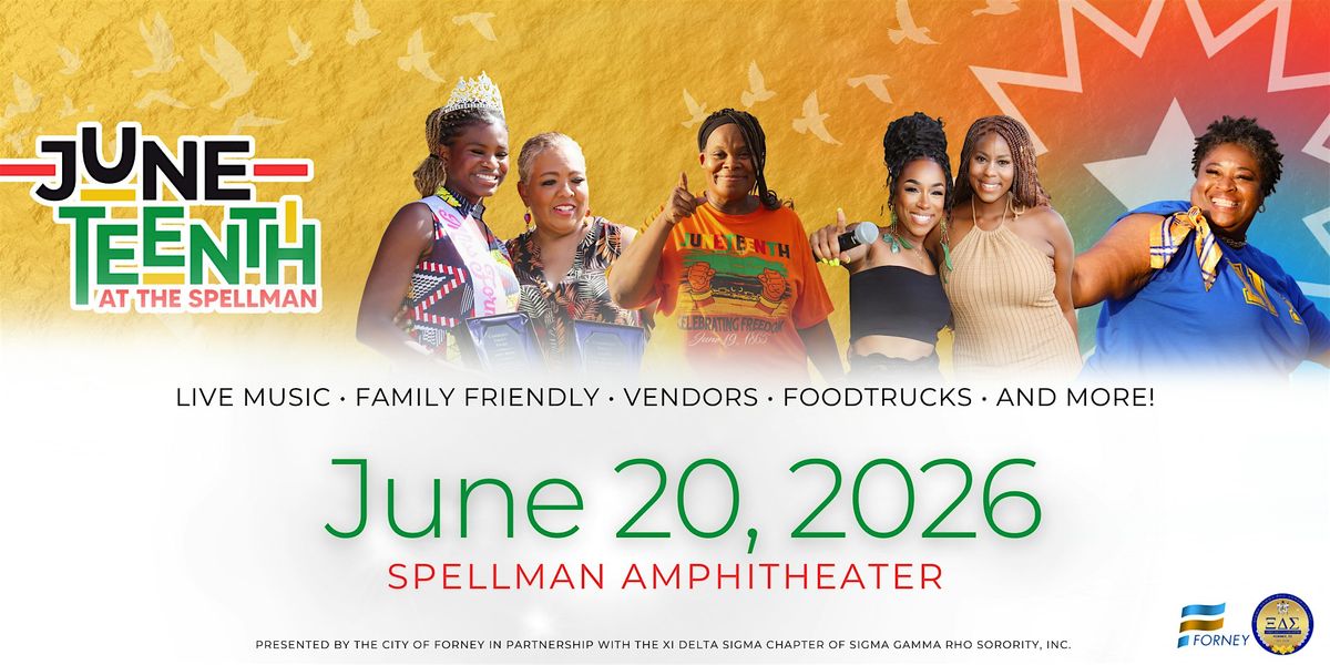 The City of Forney proudly presents Juneteenth at the Spellman in partnership with the Xi Delta Sigma Alumnae Chapter of Sigma Gamma Rho Sorority, Inc. Join us on June 20, 2026, from 4:00 PM to 9:00 PM at the Spellman Amphitheater for an evening of community, culture, and celebration.