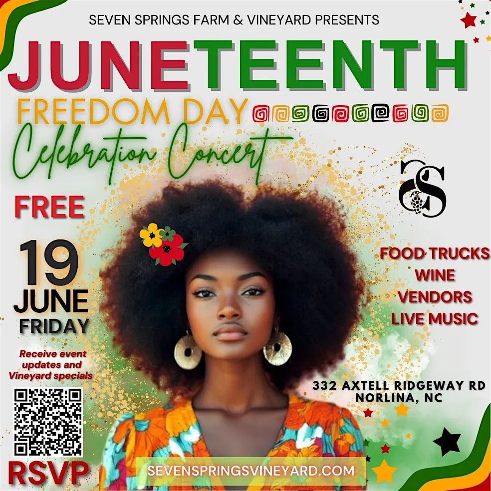 Join us at Seven Springs Farm and Vineyard for an unforgettable Juneteenth Festival celebrating culture, freedom, and community 🎉. Enjoy a curated selection of wines 🍷 from our vineyard, non-alcoholic juices and ciders 🧃, indulge in delicious bites from local food trucks serving everything from BBQ 🍖 to soul food 🍗, and shop unique handcrafted goods from talented local vendors 🛍️. Immerse yourself in live music 🎶, dance performances 💃🏽, and cultural activities that honor the spirit of Juneteenth ✊🏾. With fun for all ages 👨👩👧👦, it’s a day to raise a glass 🥂, celebrate heritage 🌍, and make lasting memories with friends and family in a beautiful vineyard setting 🍇.