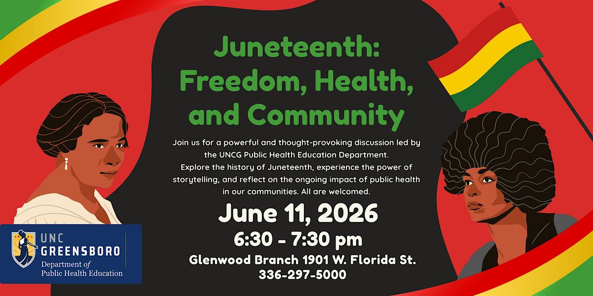 Joining us is UNCG Public Health Education Department, this reflective and educational program honors Juneteenth by exploring its historical roots and continued relevance through storytelling, discussion, and a public health lens. Participants will examine how freedom, access, and health outcomes intersect, gaining deeper insight into the lasting impact of emancipation on Black communities today. The program encourages dialogue, reflection, and community connection in a supportive environment.