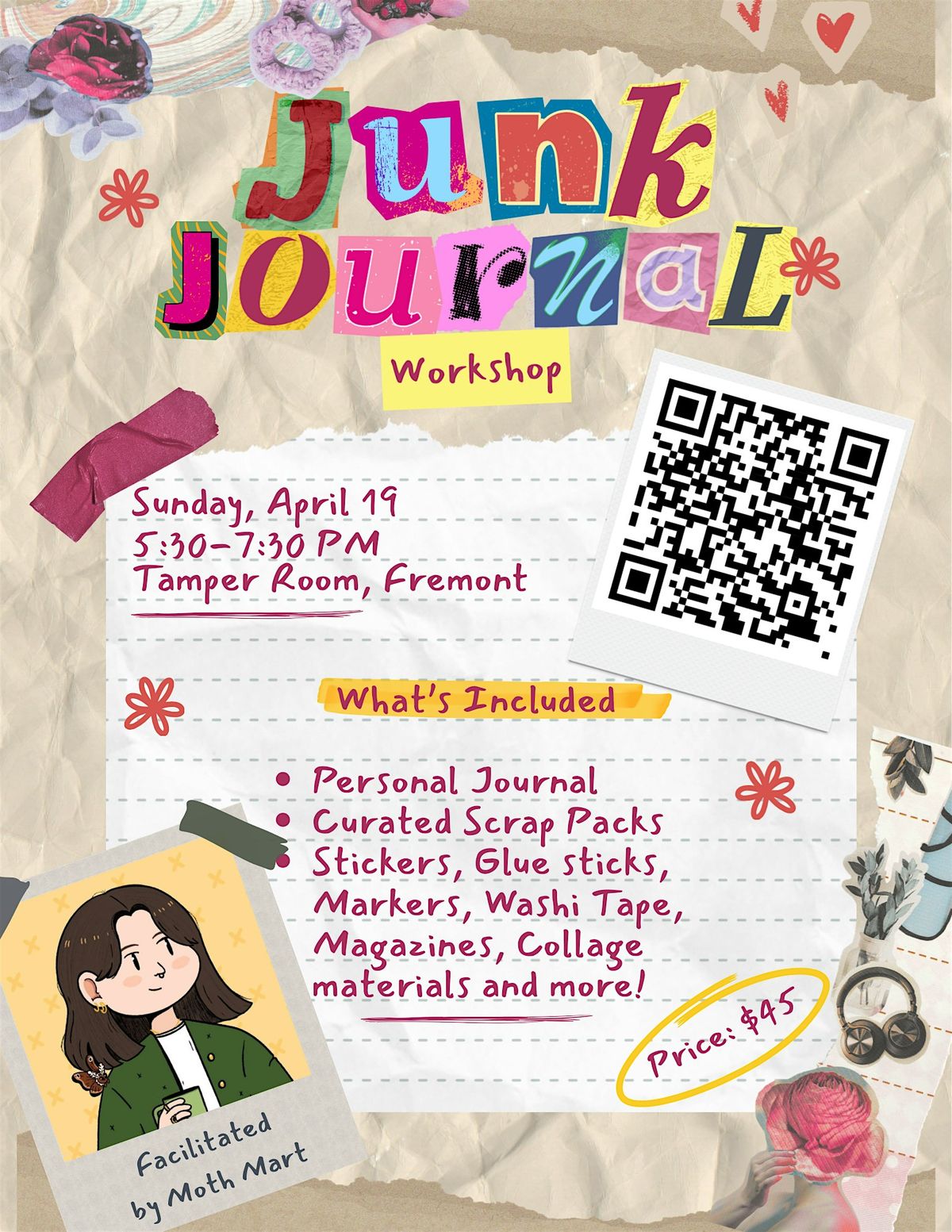 Unleash your creativity and make something uniquely yours! In this hands-on workshop by Moth Mart, you’ll create your own junk journal—a playful, imperfect journal made from layered scraps, textures, and found materials.