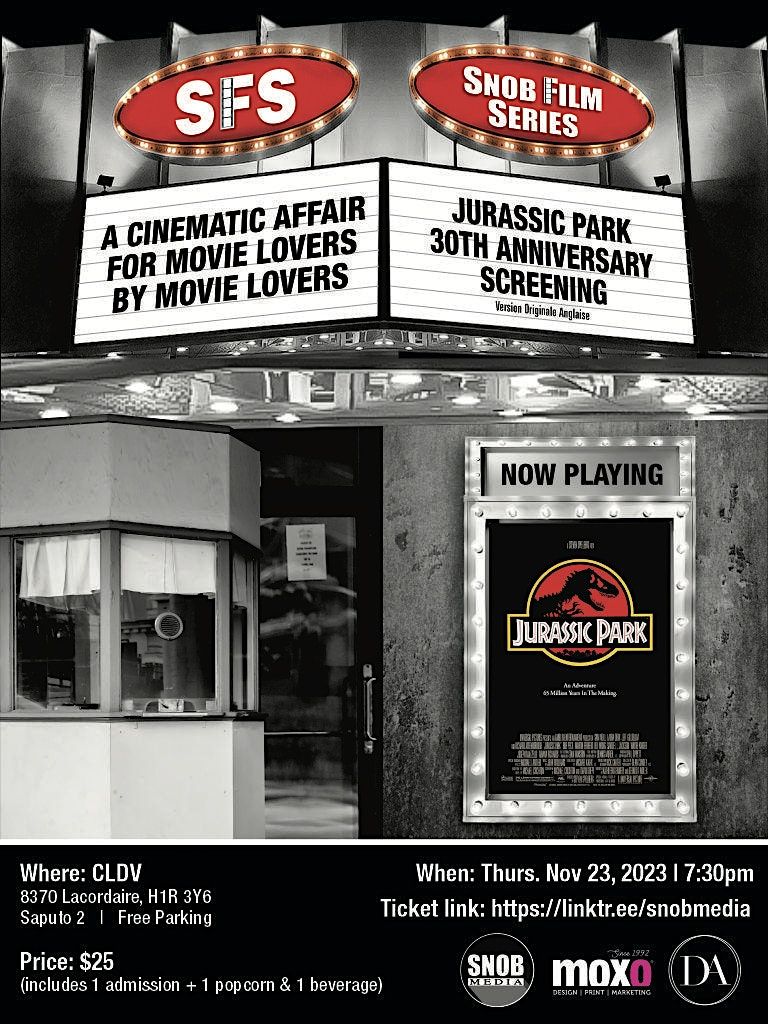 We know you can watch it at home, but it just isn't the same. Join us for a thrilling cinematic experience at the **Jurassic Park | 30th Anniversary | Snob Film Series** event! Step back in time and celebrate the iconic film that revolutionized the world of dinosaurs on **Thurs, Nov 23rd, 2023**, at **7:30pm**. Hosted by Gianni Fiasche and Hypeman Steve from Snob Media.