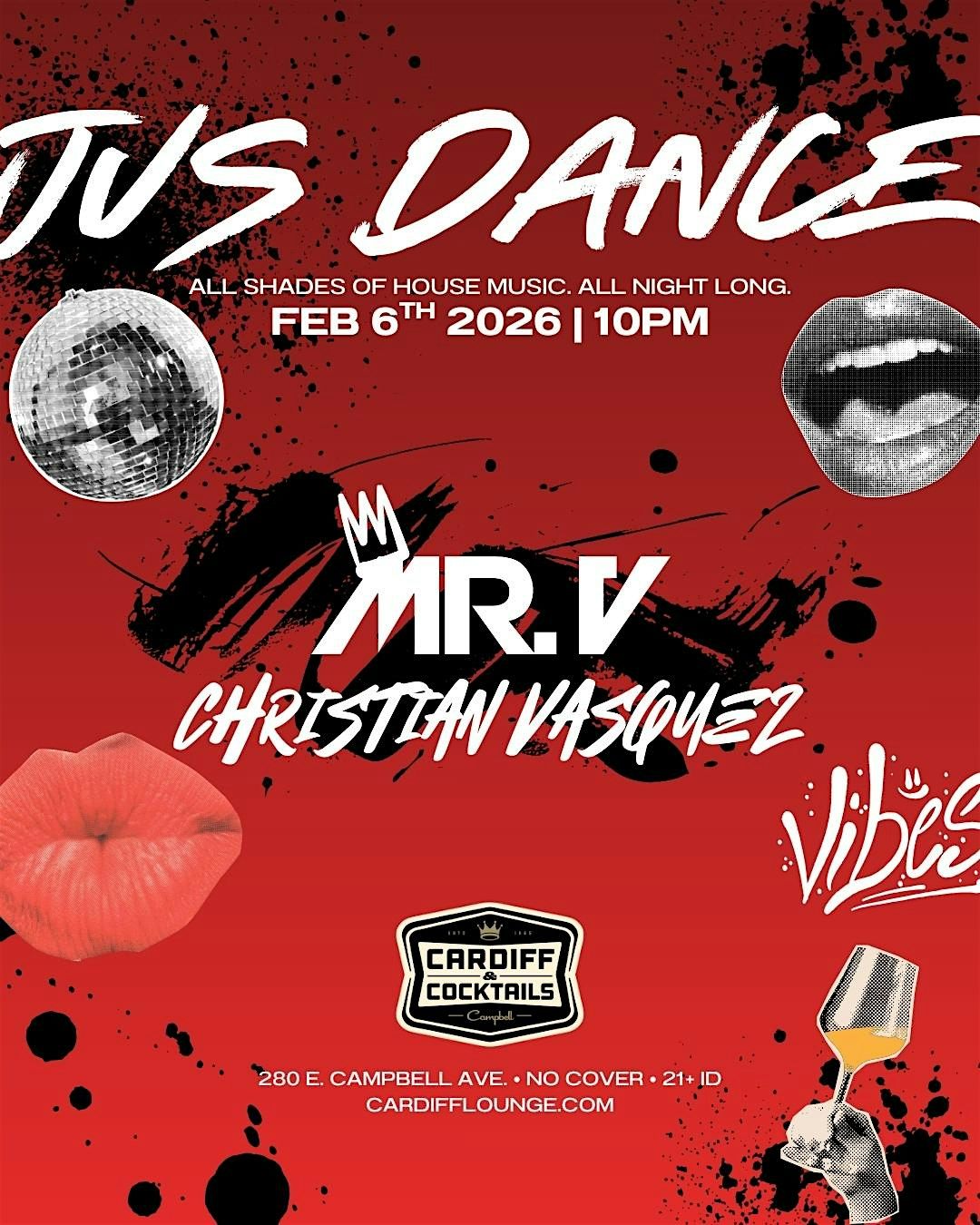 Sole Channel Events presents Jus Dance with DJ Mr. V & Friends Every Friday night, the dynamic and soulful sounds of House Music echo through the vibrant atmosphere of Cardiff & Cocktails, the hottest spot in Campbell, California.