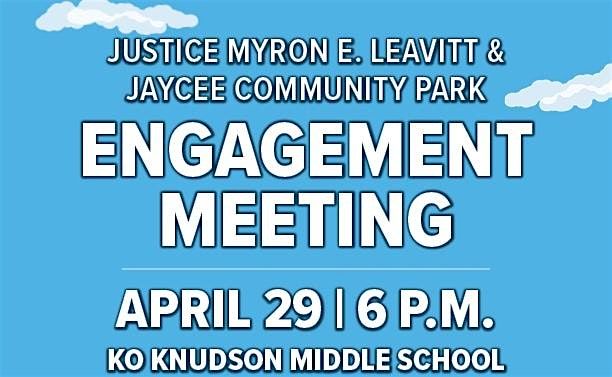 Join us for the Justice Myron E. Leavitt & Jaycee Community Park Engagement Meeting on Wednesday, April 29, 2026, at 6 p.m. in the K O Knudson Middle School Library, 2400 Atlantic Street. We’ll share survey results and gather additional feedback from the community to help guide future improvements at the park. Your input matters and will help shape a space that serves everyone.