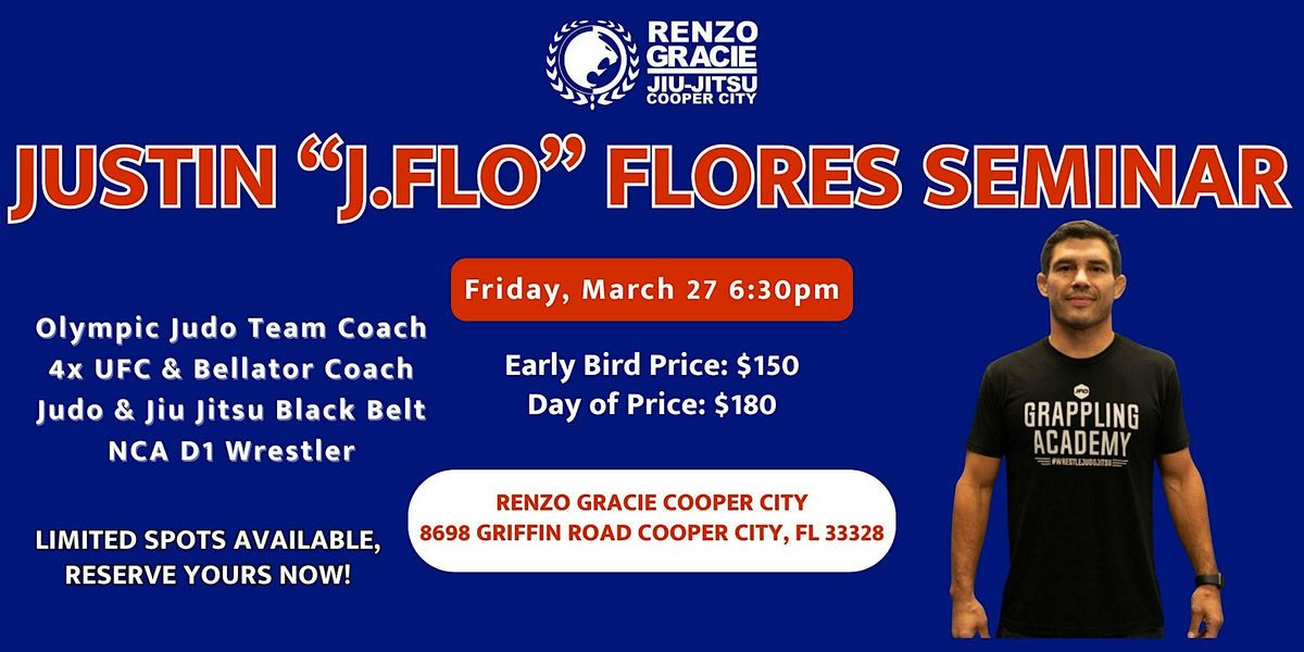 Learn from world famous Olympic judo team coach and 4x UFC & Bellator coach Justin "J.Flo" Flores in person at Renzo Gracie Cooper City.
