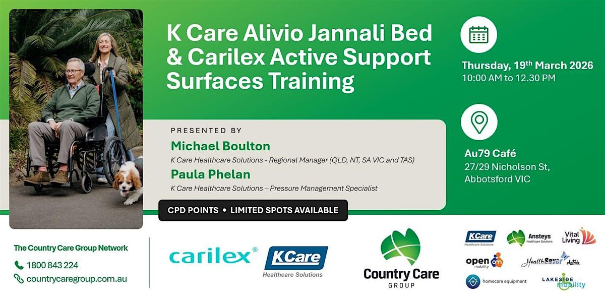 Country Care Group Abbotsford is excited to collaborate with K Care Healthcare Solutions to invite you to an exclusive, in‑person product training session focused on the Alivio Jannali Multi‑Function Bed and Carilex Active Support Surfaces.