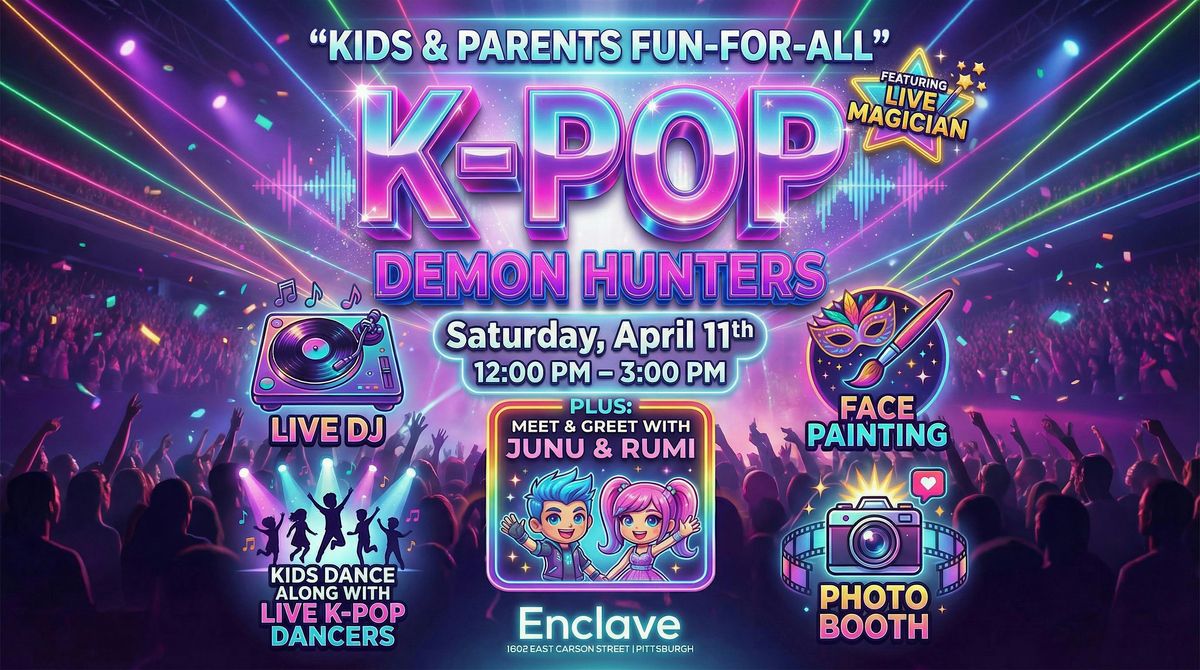 K-Pop Demon Hunters: Kids & Parents Fun-For-All is the ultimate interactive kids and family experience combining music, dance, entertainment, and magical moments all in one high-energy celebration. Join us on Saturday, April 11th from 12:00 PM–3:00 PM at Enclave (1602 East Carson Street, Pittsburgh) for a vibrant afternoon designed for K-pop fans, families, and young performers alike.