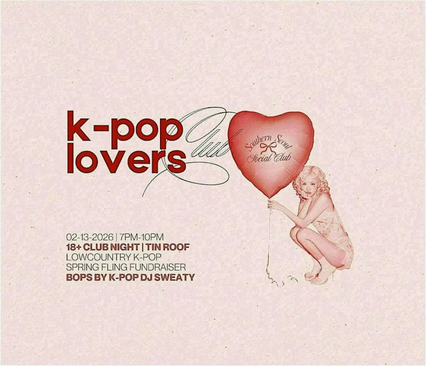 💖 All proceeds from the night help fund the Third Annual Lowcountry K-pop Spring Fling, the largest K-pop celebration in South Carolina! Your support helps keep this all-ages event free and full of merch vendors, dance showcases, RPDs, photocard trading, and fan-focused fun.