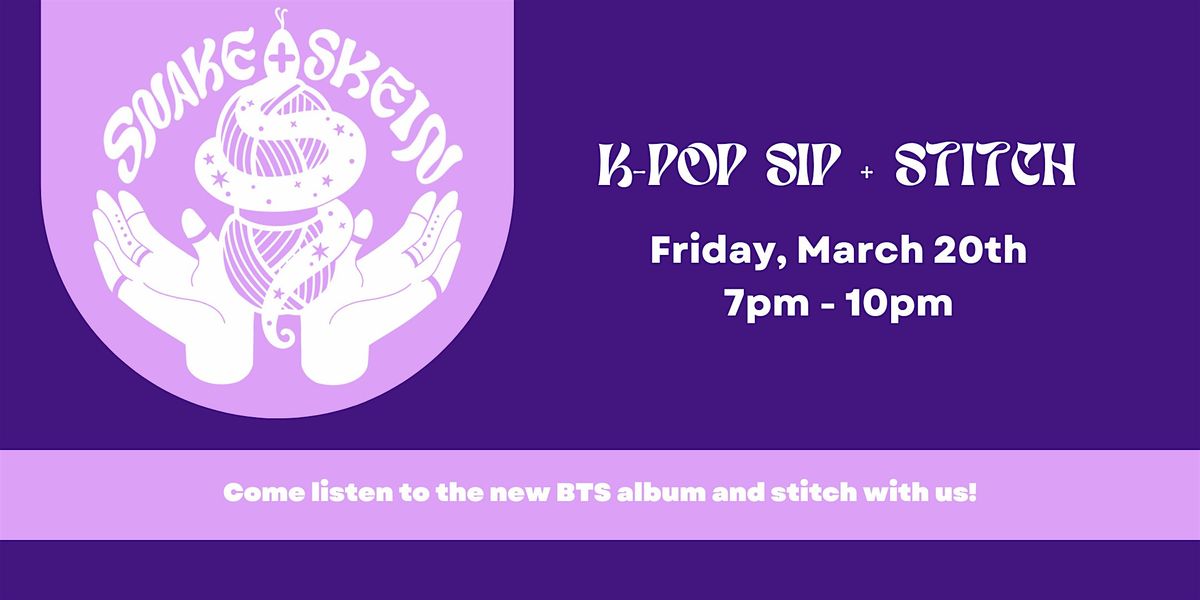 Join Snake + Skein for a sip + stitch themed around K-Pop! Listen to the new BTS comeback, trade photo cards, or just vibe with us at the shop!