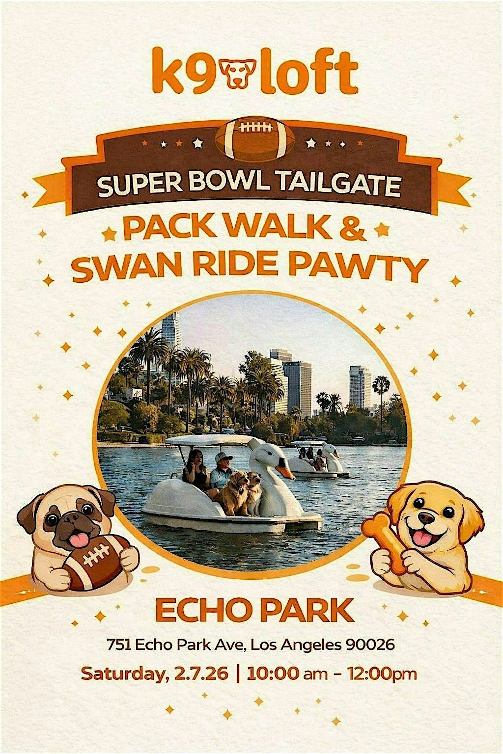 Join us for a tail-waggin’ good time at the Super Bowl Tailgate Pawty hosted by K9 Loft at beautiful Echo Park Lake! This one of a kind dog friendly event features two pack walks around the lake with city views, photo ops, and happy pups followed by an unforgettable swan boat ride experience with your furry best friend.