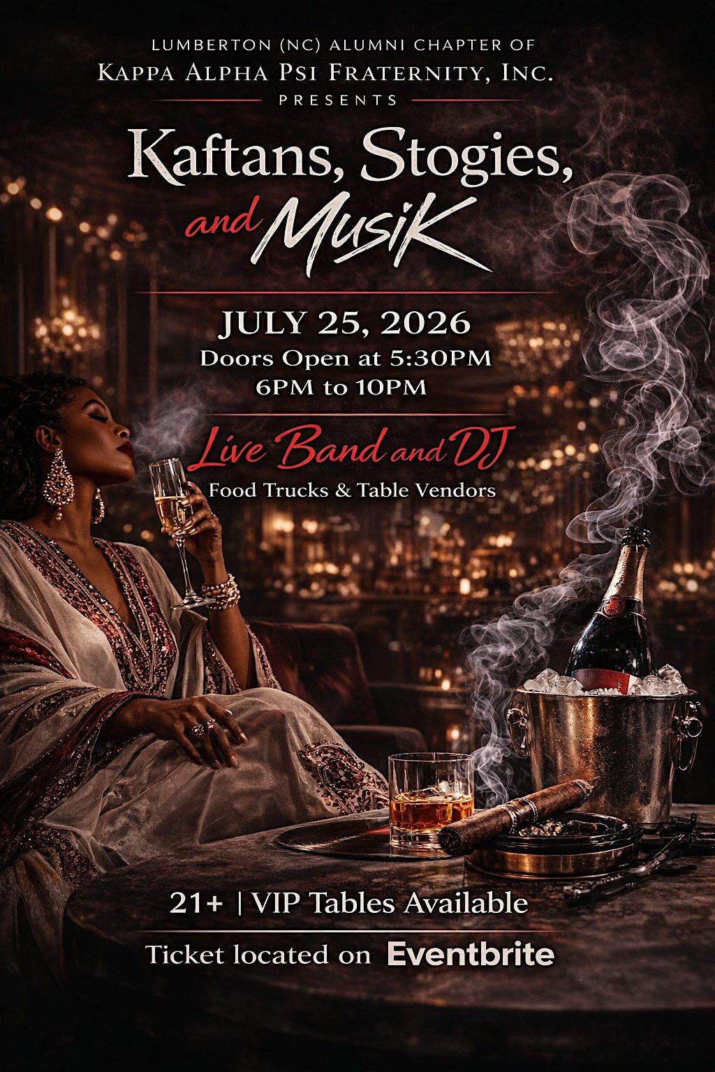 Kaftans, Stogies, and MusiK is an elevated outdoor cultural experience hosted by the Lumberton Alumni Chapter of Kappa Alpha Psi Fraternity, Inc. This signature event blends style, sophistication, and purpose—inviting guests to don elegant kaftan attire while enjoying premium cigars, curated musical entertainment, and an atmosphere centered on fellowship and celebration.