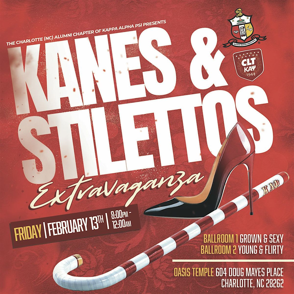 The Charlotte Alumni (NC) Chapter of Kappa Alpha Psi Fraternity, Inc. presents the Kanes & Stilettos Extravaganza - a signature experience for those looking to add a twist to their Valentine's Day Weekend. The event will be held at The Oasis Shriners Temple - 604 Doug Mayes Pl, Charlotte, NC 28262.