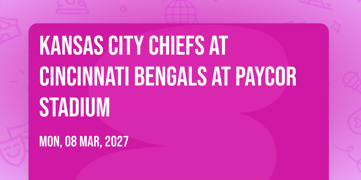 π Prepare to be amazed at Kansas City Chiefs at Cincinnati Bengals at Paycor Stadium, the most anticipated gathering of the season! π Set against the stunning backdrop of Paycor Stadium in vibrant Cincinnati, OH, this event promises to redefine your expectations. π Mark your calendars for March 8th, 2027 at 11:59 PM and get ready to immerse yourself in an atmosphere of wonder and excitement. β¨ From the moment you arrive, you'll be transported into a world where memories are made and stories come alive. They have crafted an experience that perfectly harmonizes entertainment, innovation, and community spirit. π Join us as we create moments that will be discussed for years!