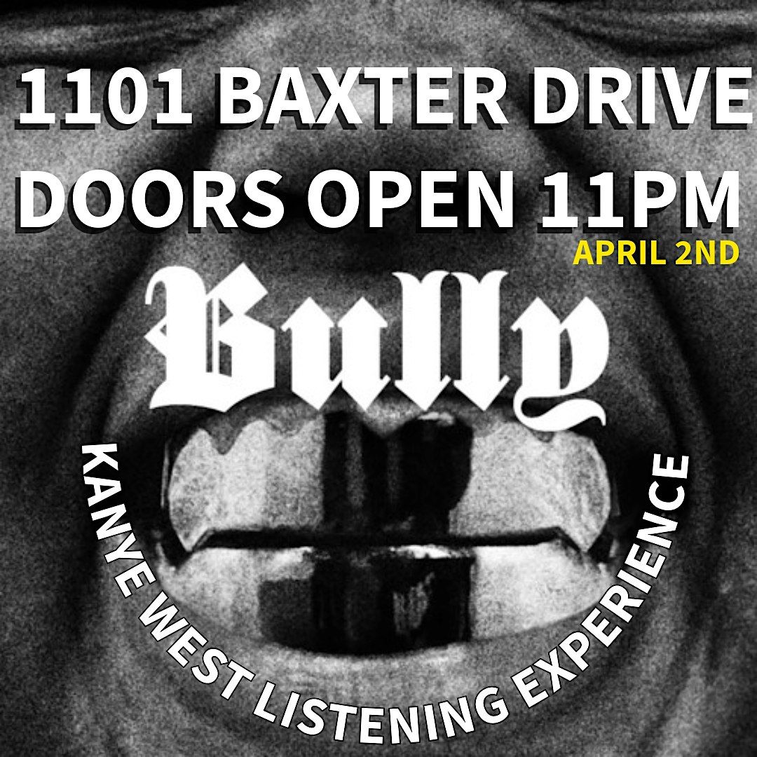 Free Kanye West “BULLY” listening, 11PM doors, 11:18 start, 1101 Baxter Rd. Dress Ye-inspired—afterparty with Kanye all night.About this Event