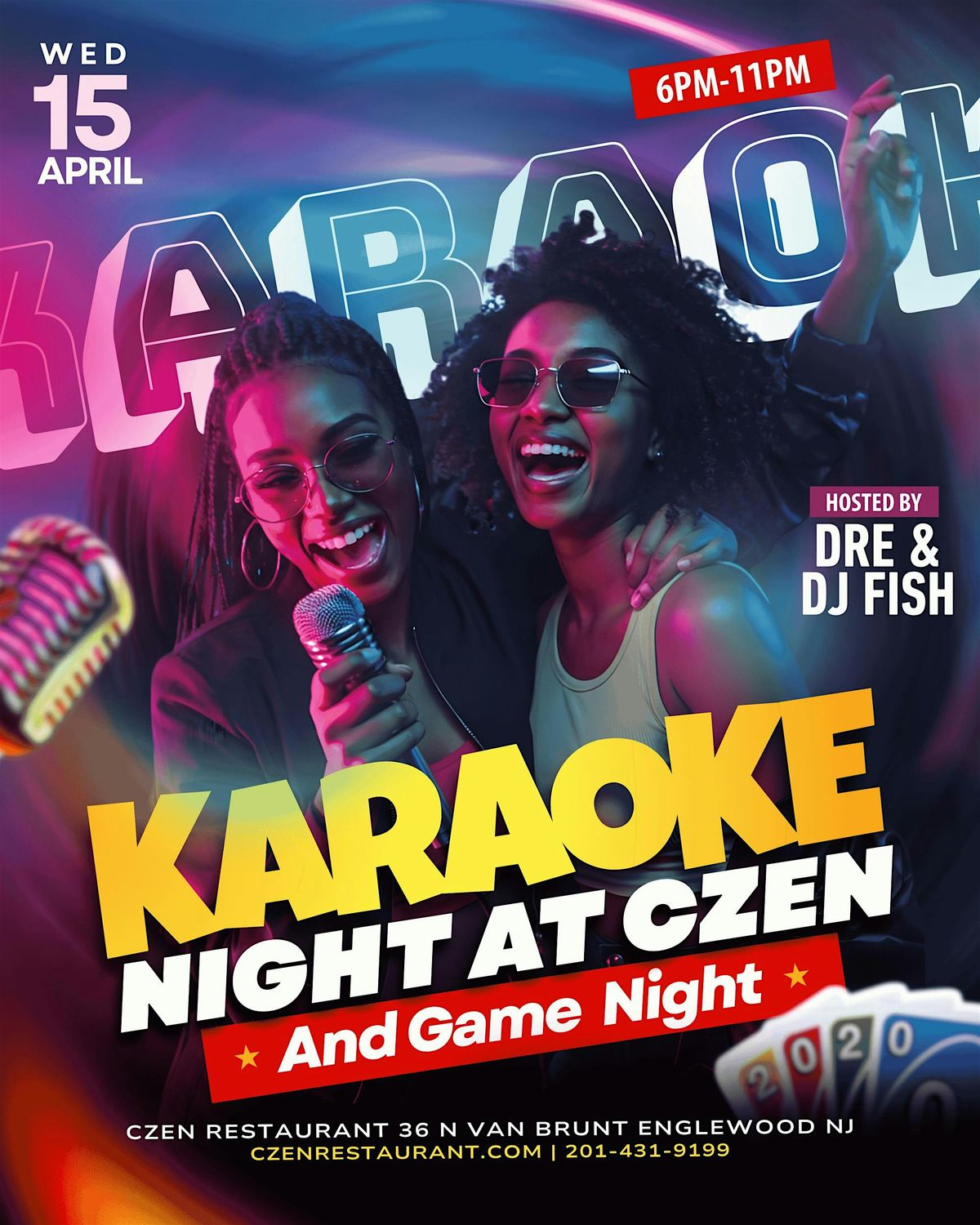 Karaoke & Game Night @ Czen Englewood! Wed, 4/15. 6-11PM. Hosted by Dre & DJ Fish. Caribbean-Asian fusion & big vibes. czenrestaurant.comAbout this Event