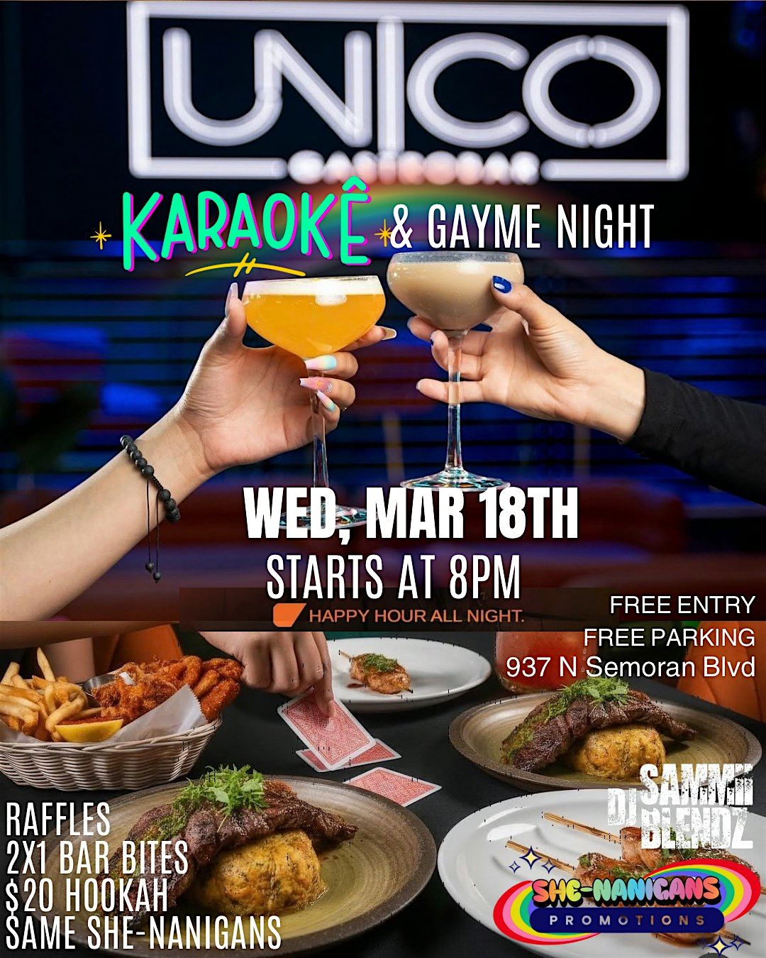 Sapphic Karaoke & Gayme Night Join She-Nanigans Promotions for a night of sapphic chaos @unicogastrobar โ Happy Hour All Night!!!