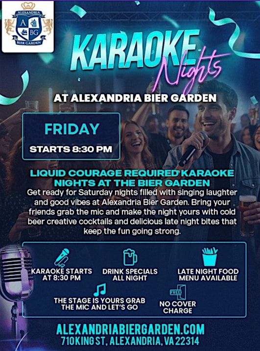Come join us for a fun-filled evening of karaoke starting at 8:30PM at Alexandria Bier Garden! Calling all rockstars, shower singers & party people.. It's Karaoke Night at ABG. Over 65,000 songs, ice-cold beers, and the crowd to cheer you on! Get ready to sing your heart out and dance the night away at 710 King Street, Alexandria, VA, USA. It's the perfect way to unwind and have a blast with friends. See you there