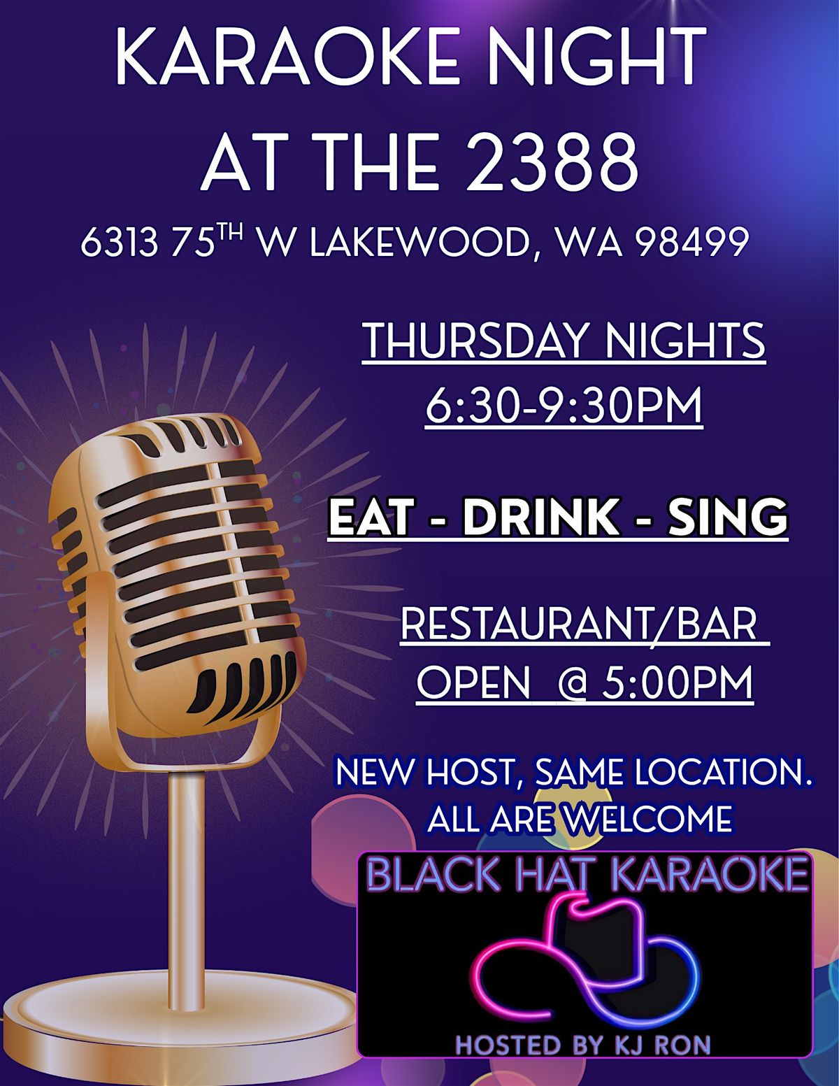 LET'S SING! HOSTED BY BLACK HAT KARAOKE. HUGE CATALOG OF MUSIC FROM ALL GENRES, FULL RESTAURANT & BAR, ALL ARE WELCOME TO JOIN US!About this Event