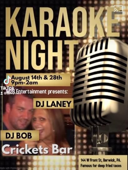 Join us on August 14 with DJ Laney and DJ Bob at Crickets (144 West Front Street Berwick PA)