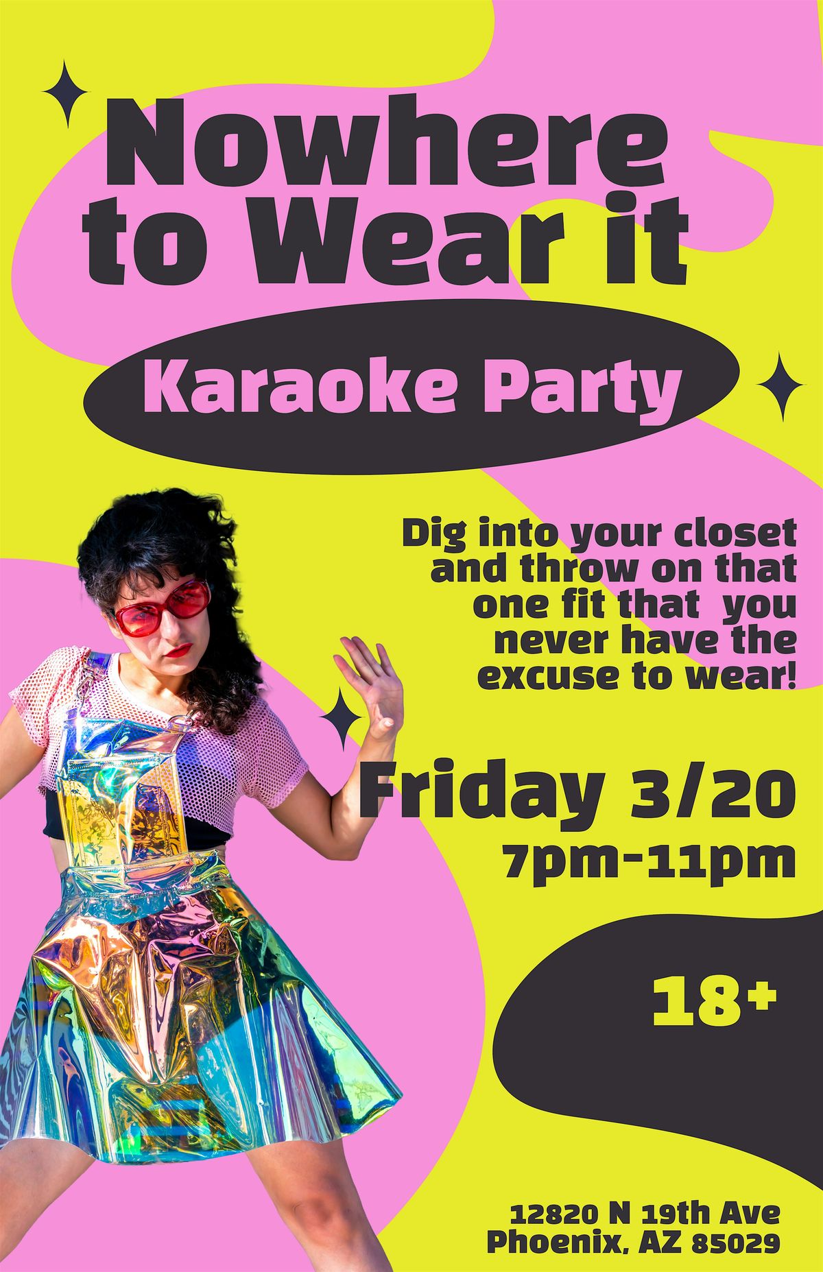 Join us for the Karaoke Party: Nowhere To Wear It – an in-person event where you can belt out your favorite tunes, meet cool people, and just have a blast. Whether you're a shower singer or a stage star, this is the perfect chance to shine! Bring your energy, your friends, and your best vocals. Let's make some unforgettable memories together! Dig into your closet and find that one fit you never have an exxcuse to wear!