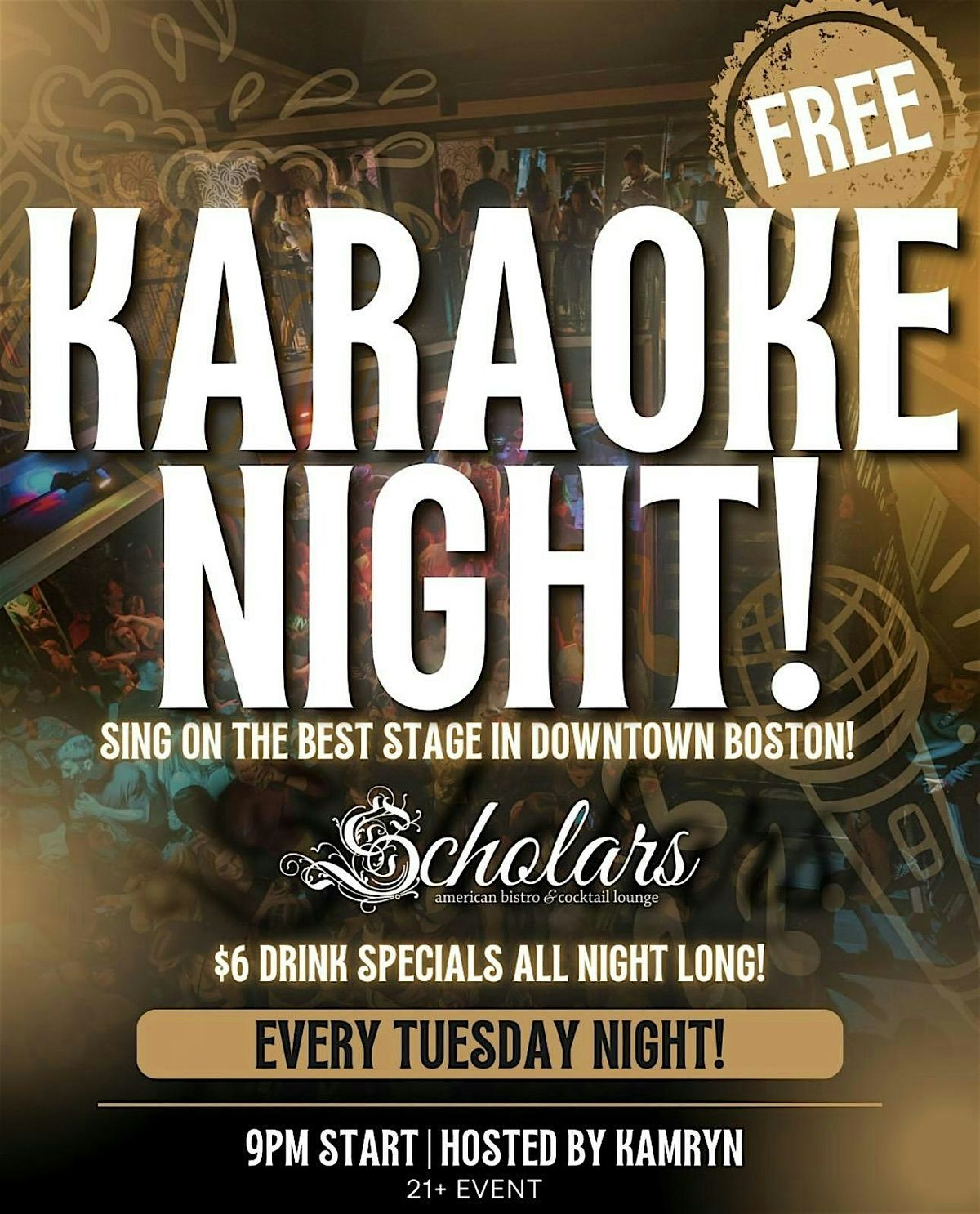 It's FREE Karaoke Night every Tuesday at Scholars Boston Bistro — sing your heart out on the best stage downtown, sip on $6 drink specials, and turn your Tuesday into a full-on main character moment.
