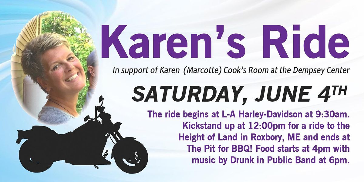 Karen's Ride for the Dempsey in 2022 will be held on Saturday, June 4, 2022. The ride will start at L-A Harley Davidson and end at The Pit Bar & Grill for food and drinks and music sponsored by L-A Harley Davidson.