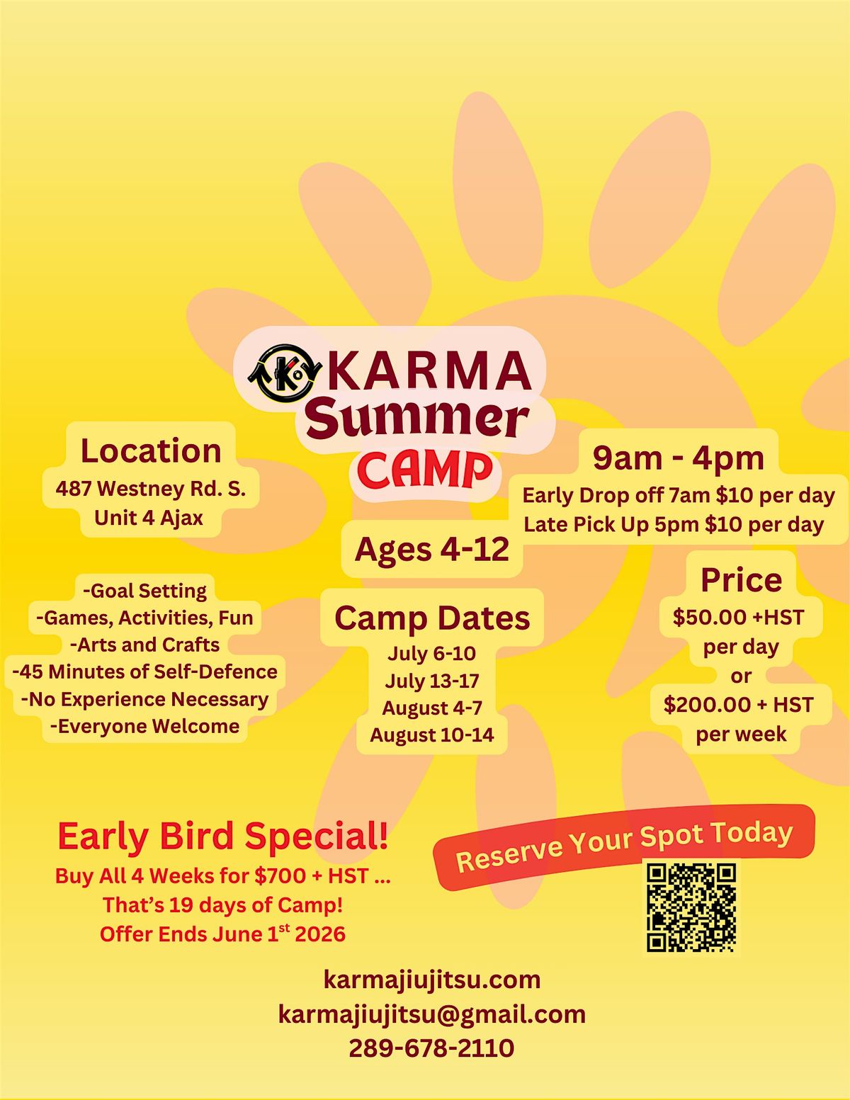 At Karma Summer Camp, kids can expect high-energy days filled with movement, learning, and connection. Each day includes a structured self-defence lesson focused on confidence, discipline, and real skill development... all taught in a safe, supportive environment. Beyond the mats, we intentionally support academic growth by incorporating daily reading time, writing activities, and creative learning opportunities to help prevent the “summer slide” and keep young minds sharp. Campers enjoy team games, leadership challenges, and plenty of opportunities to build friendships and teamwork. We balance fun with personal growth- physically, mentally, and academically .... because at Karma, strong bodies and strong minds grow together.