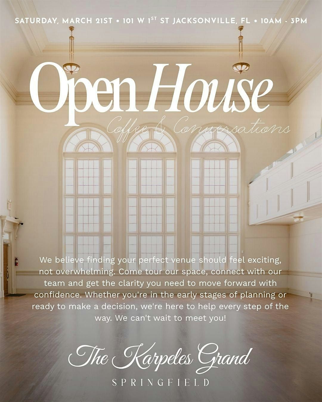 Enjoy a self-guided tour of our historic venue, meet our team, and connect with event professionals who can help make your event seamless and unforgettable. Sip on specialty coffee and refreshments while experiencing the beauty of one of Jacksonville’s most unique venues.