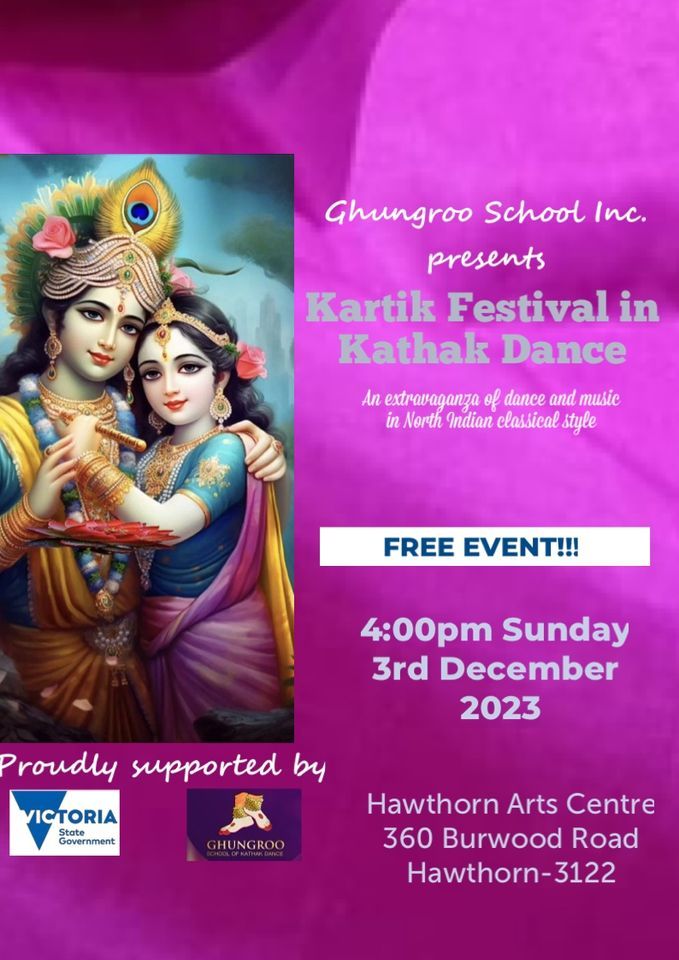 The Kartik Festival in Kathak Dance will be a celebration of the Kartik Purnima festival through a colourful dance and music extravaganza, where the North Indian Classical stream of Kathak dance will be performed along with the accompaniment of music in Hindustani Classical style. This event is proudly supported by the Victorian Government Multicultural Festivals and Events program. You all are invited to this free event.