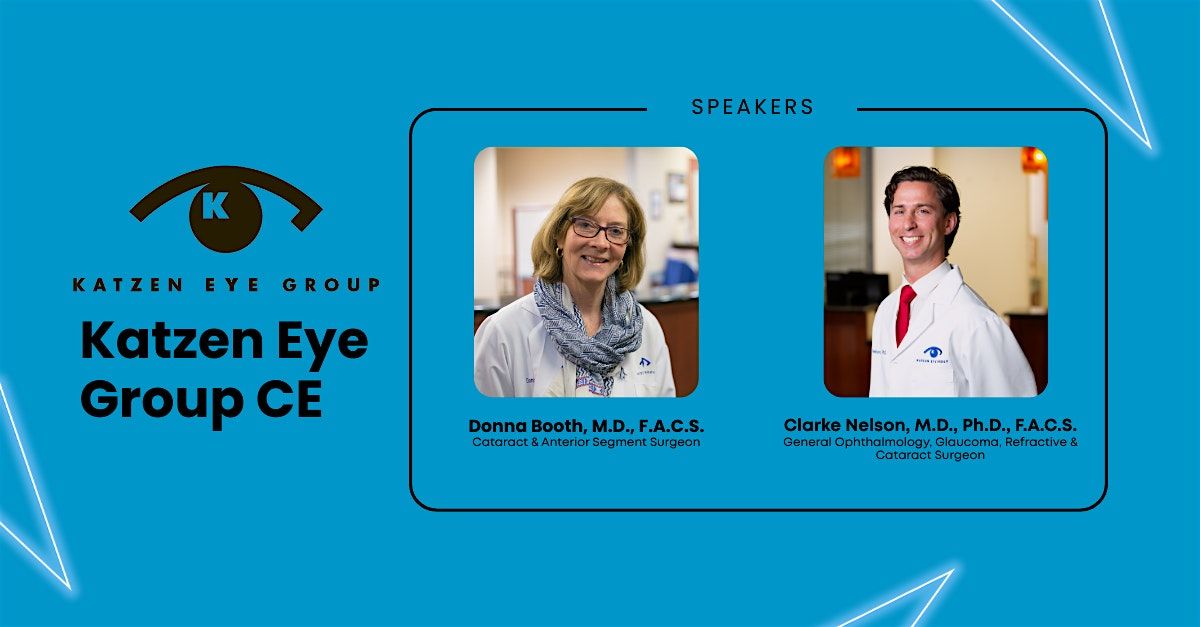 Katzen Eye Group will host a 2-hour COPE-approved continuing education event on Thursday, May 14th, starting at 6:30 pm for dinner, with lectures beginning at 7:00 pm. This event will be held at our Lutherville, MD office.