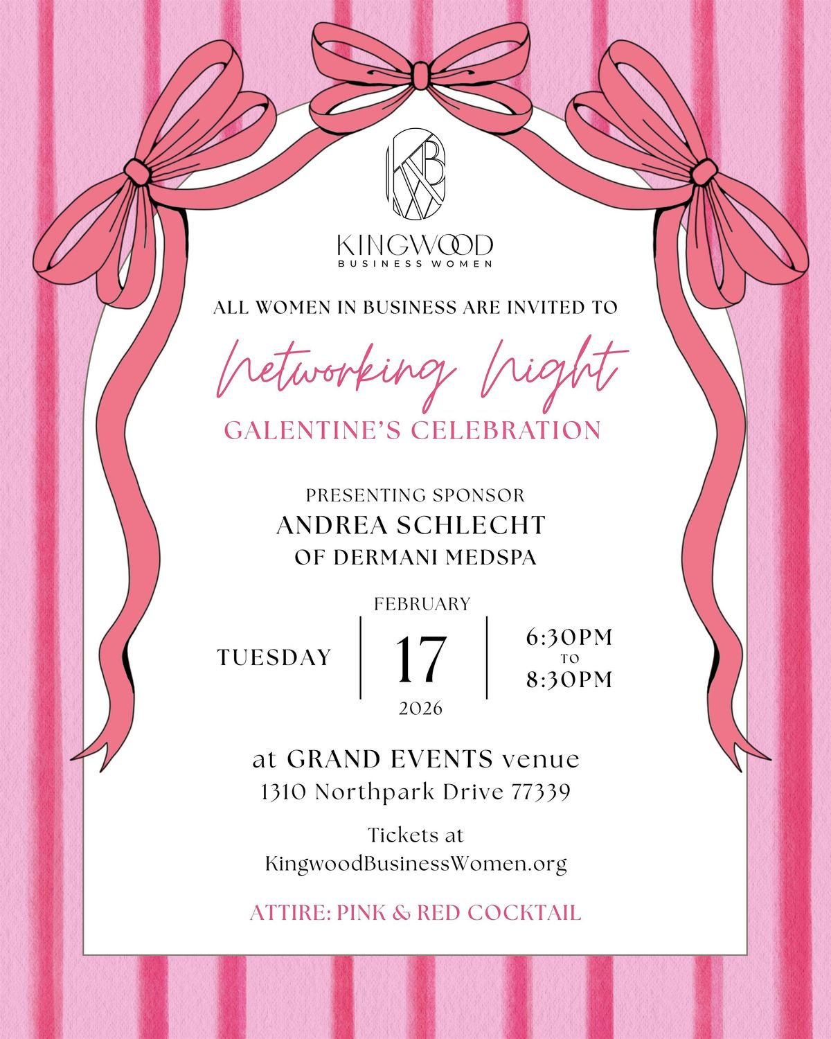 You're invited to join us for the Kingwood Business Women's Galentine's event! An evening filled with quality networking with industry-leading professionals and business-owning women!