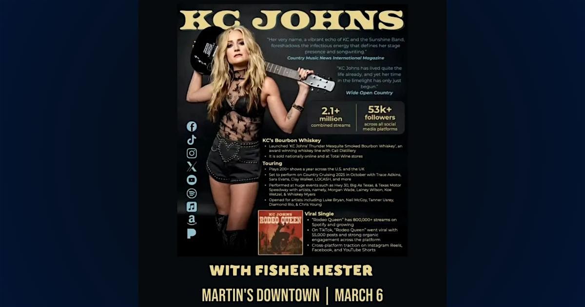 Born in Memphis, Tennessee, and raised in Hernando, Mississippi, KC Johns was immersed in music early on. Named after KC and the Sunshine Band and inspired by artists including Led Zeppelin, Stevie Nicks, and Sheryl Crow, Johns formed a band by the age of 17. In 2017, she packed up her guitar and headed for Nashville, singing on Broadway stages before landing an opportunity to perform with Carnival Cruise Lines. What was meant to be a six-month contract turned into several years of international touring, honing her stage presence, and connecting with global audiences. KC Johns has built an impressive performance résumé since then. She was featured in Dolly Parton’s Coat of Many Colors at Dollywood, opened for major artists like Luke Bryan, Chris Young, Randy Houser, Trailer Choir, and Morgan Wade, and performed at esteemed events, including Texas Motor Speedway, Big As Texas Festival, HWY 30 Music Fest, and Country Cruisin’.