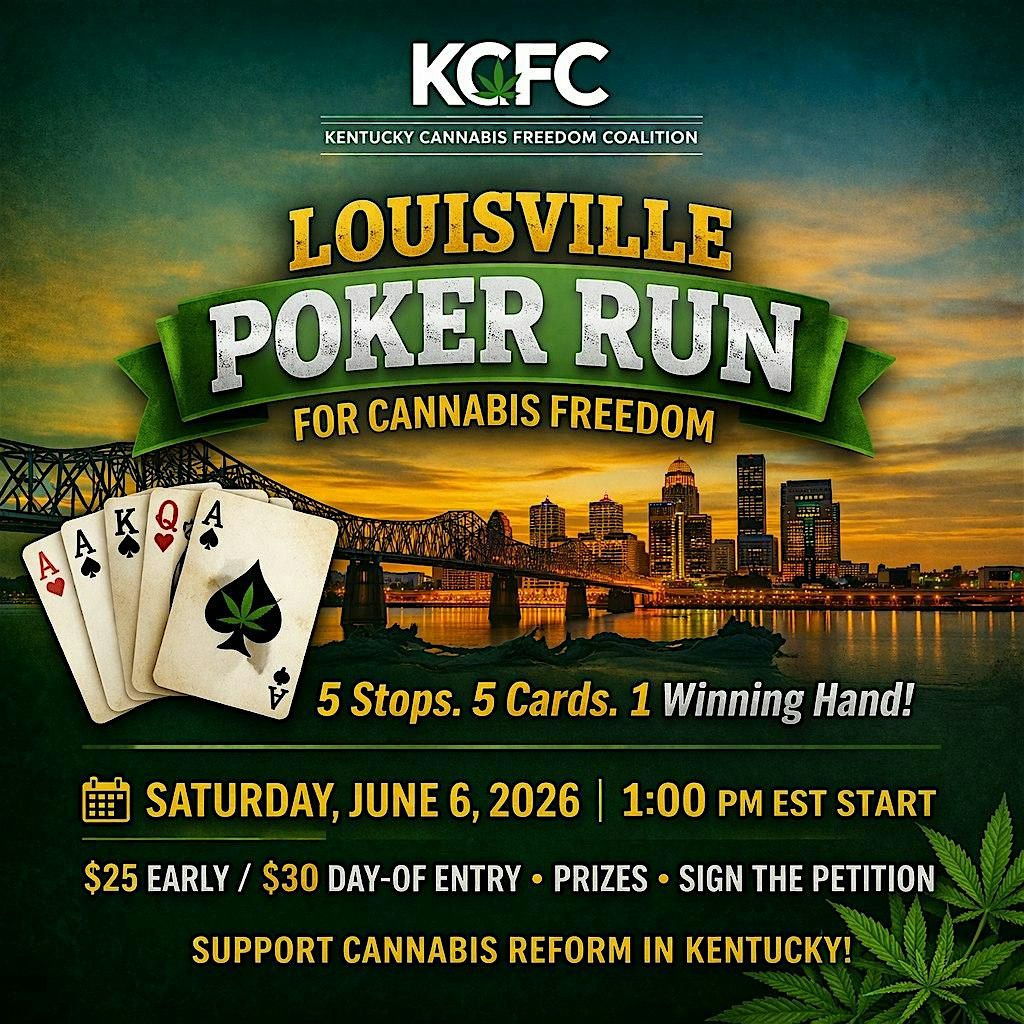 Get ready, Louisville — it’s time to stack the deck for freedom. Join the Kentucky Cannabis Freedom Coalition (KCFC) for an exciting Poker Run on Saturday, June 6, 2026, starting at 1:00 PM EST. Travel across five stops, draw your cards, and build the best hand for a chance to win prizes — all while supporting cannabis reform in Kentucky. This isn’t just an event, it’s a movement. Along the way, connect with supporters, sign the petition, and help push real change forward. Whether you’re coming for the fun, the cause, or the chance to win, this is your moment. Entry is $25 in advance or $30 at the event, with optional add-ons to boost your odds. Bring your crew, share the experience, and let’s build momentum together across Kentucky.