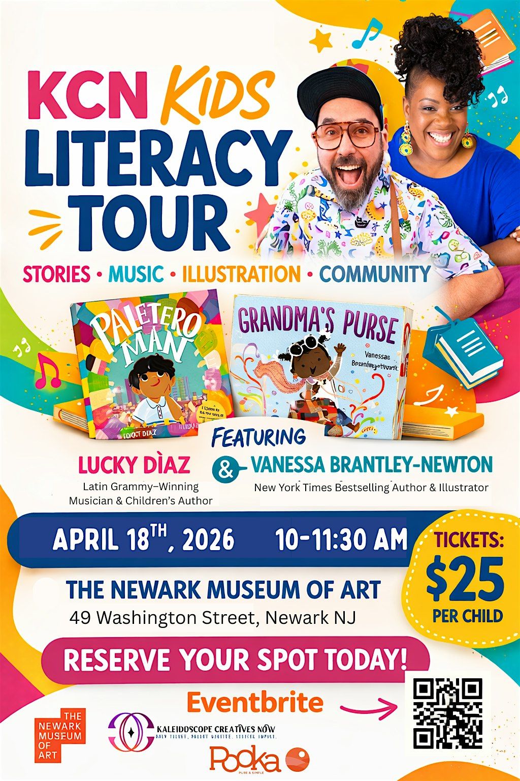 Join us in Newark for an inspiring and joyful literacy celebration featuring beloved author and illustrator Vanessa Brantley-Newton and Grammy-winning musician Lucky Diaz. Families will gather at The Newark Museum of Art for a lively morning filled with storytelling, music, creativity, and the magic of books.