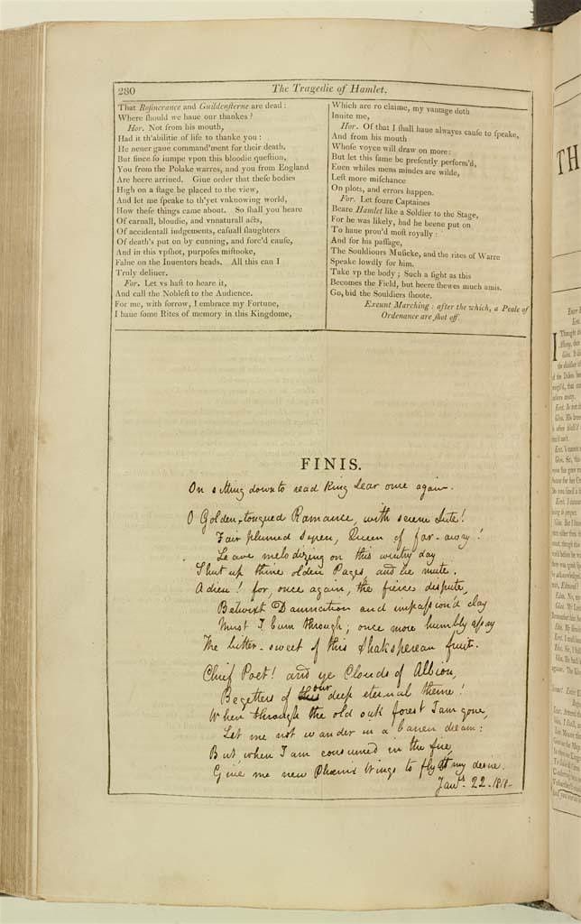 Image ALT text: Part of a page from John Keat's 1808 facsimile copy of the 1623 Shakespeare folio, on which Keats's has written his poem 'On Sitting Down to Read King Lear Once Again.'