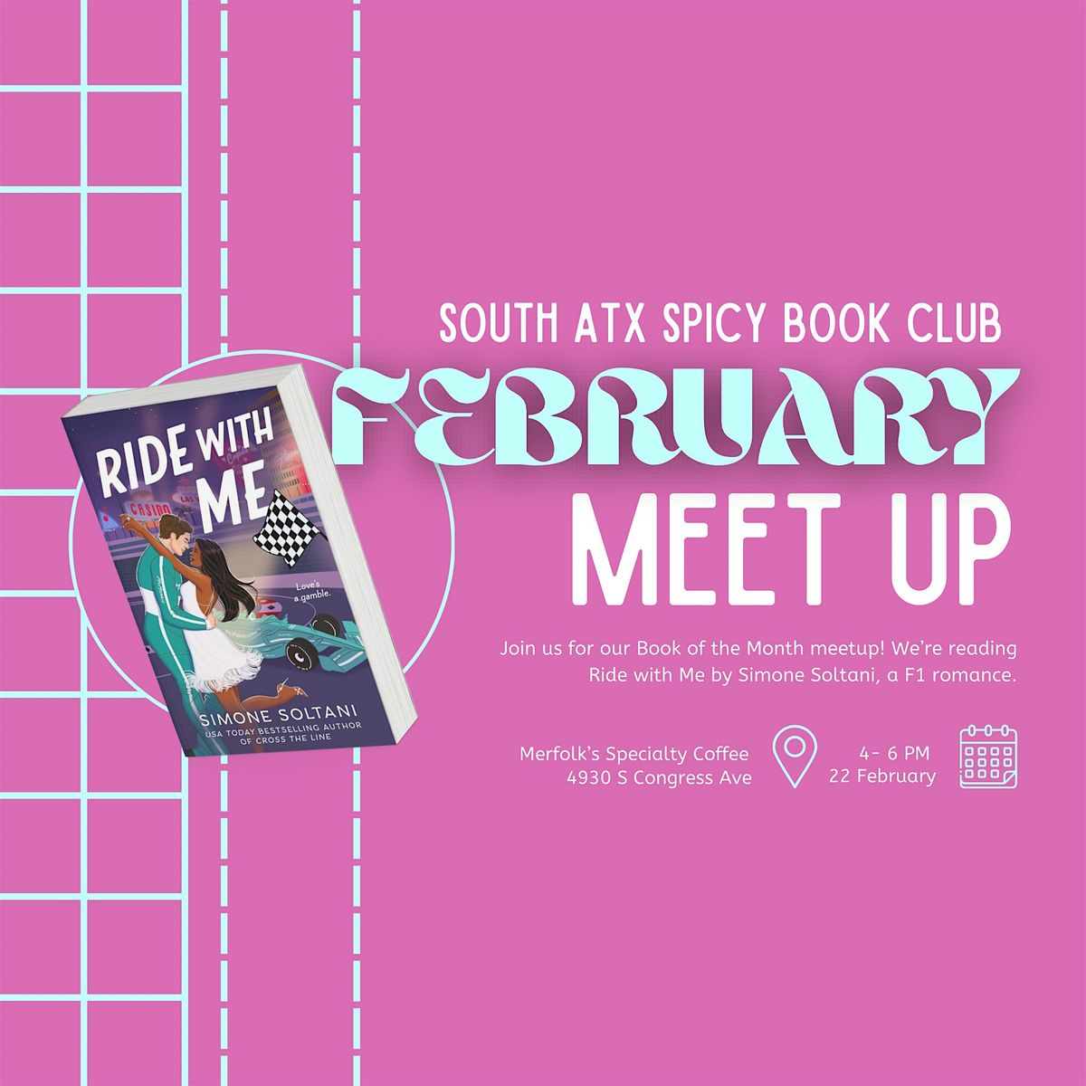 Hey there, romance lovers! February’s checkered hearts theme is bringing the heat with our BOTM pick: Ride with Me by Simone Soltani. Expect smutty F1 vibes, great conversation, and plenty of swooning with fellow romance readers.