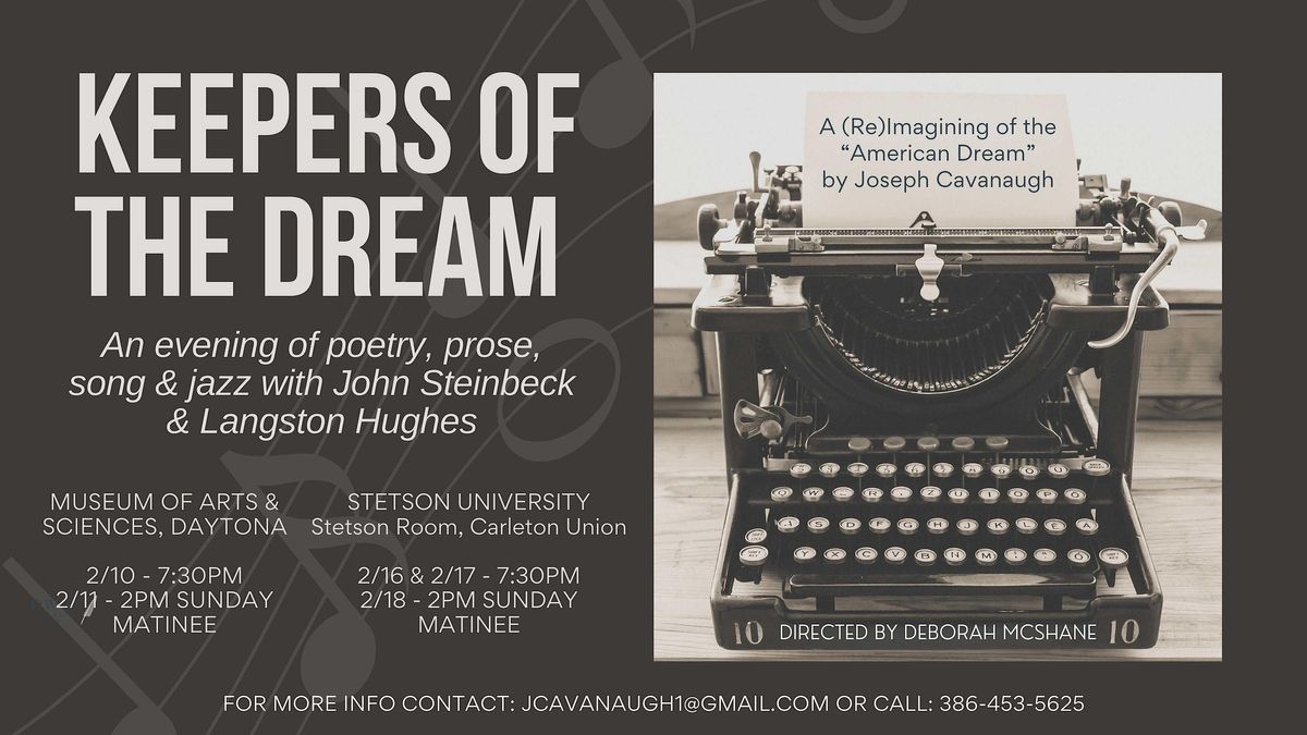 Join us for an unforgettable experience Friday, Saturday, or Sunday, Feb 16-17-18, 2024, in the Stetson Room at Carleton Union, Stetson University in DeLand. Enjoy the words and music of the 1930s and the 1960s as you immerse yourself in a mesmerizing event that celebrates the American Dream, exploring the writings of Nobel Prize winning novelist John Steinbeck and Award-winning poet Langston Hughes. Friday & Saturday shows are at 7:30 pm; Sunday matinee begins at 2:00 pm.